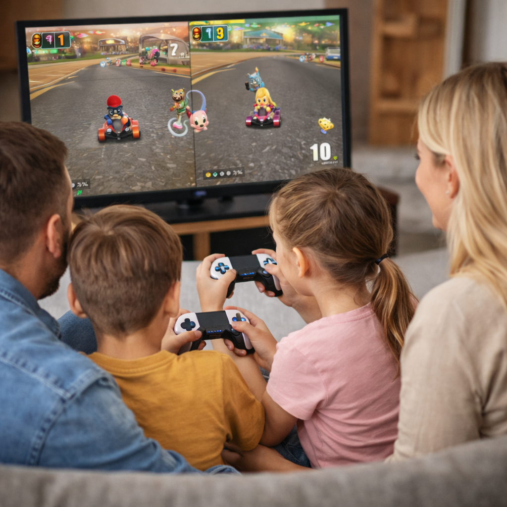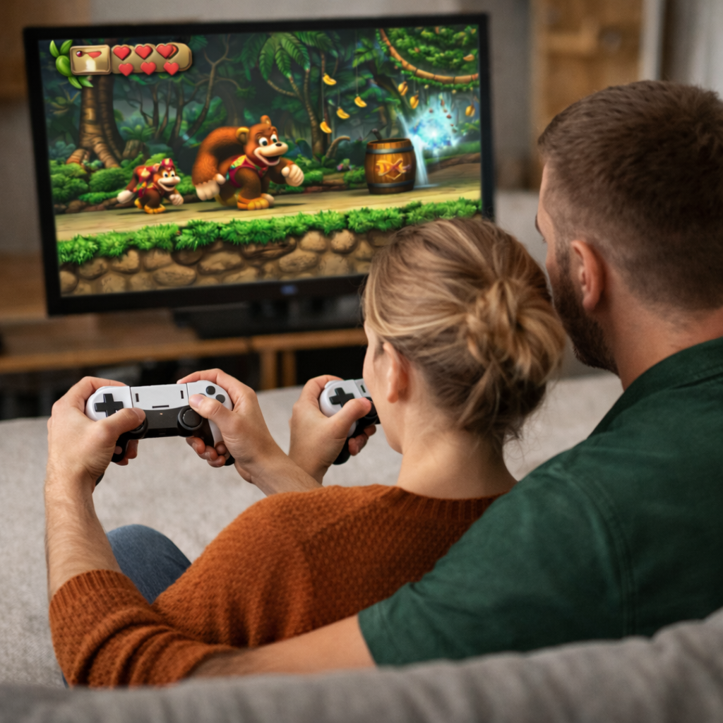 Just plug in the included cable and you’re ready to play — it works perfectly with modern TVs, 4K screens, and standard monitors.